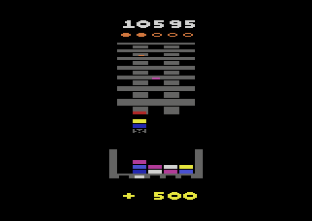 The gimmick with the iron bricks is that they’re indestructible. In theory, a line of them is a solid line. Except that obviously isn’t the case, as the ball literally bounced itself right through a gap that sure looks smaller than the ball itself. Now, I really, really like Neo Breakout, but hooooo boy did I have a tantrum when this happened. Granted, that was mostly on account of me trying to playfully act like I was going to throw my controller, only my timing was so far off that I popped myself right in the chin with my own controller. And mind you, this wasn’t the only time the ball behaved in weird ways around the iron bricks. It wasn’t rare at all for the ball to ricochet downward off the side of one when it was on an upward trajectory. In fact, that one happened constantly. Also, sometimes I finished a couple levels without breaking every brick. I’m not even sure what happened in those stages. When it happened a second time is when I finally consulted the instruction manual and found out about the Whammy ball. Finishing stages even though there’s still bricks left? Sometimes more than one? I found nothing, so I’m just going to assume the stages surrendered to my awesomeness. Stop snickering.
