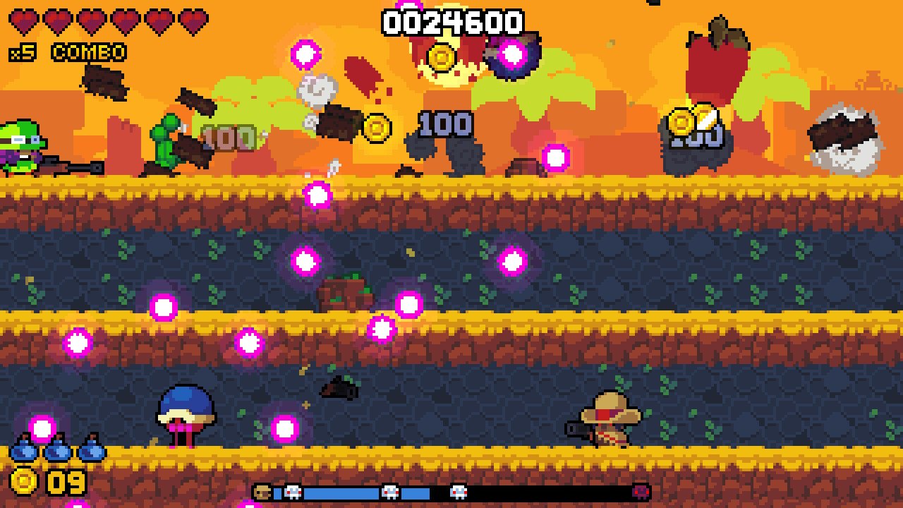 It’s absolutely uncanny how well this game is made.. for the most part. The controls are rock-solid. The simple mechanics offer exactly enough variety to never get boring, and the game ends when those ideas we do get are stretched to their fullest potential. It’s a short one. In fact, there’s an achievement for beating the game in under an hour. But that’s actually fine. It contributes to that authentic “previously undiscovered” arcade experience the gang at Resistance Studio was aiming for. It’s not exactly perfect. The variety of enemies leaves a bit to be desired, the difficulty curve spikes violently after a relatively breezy first couple worlds, and I sort of wish there were more blocks. There’s three types, but only two of them create power-ups you can use when you match three-or-more. There’s also no advantage for matching 4 or 5 blocks. It doesn’t make the weapons more powerful, nor do you get more than one weapon. On the plus side, this leaves their options wide-open for potential DLC or a sequels.