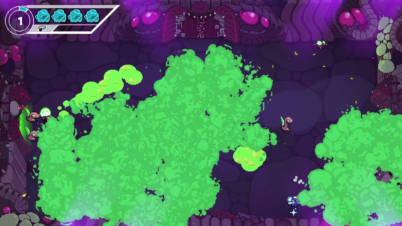 This is only the second of four worlds. There’s enemies that can unleash long-lingering screen-blockage. In a game based on fast-moving, swarming enemies. Oh, and there’s mines on the ground, usually three per room. And it gets even worse. See that green puddle peeking out? Yea, those can be entirely covered by the clouds and cause damage if you step on them. There can also be pink puddles that glue you to the floor. There’s a dash mechanic that you can upgrade that somewhat shields you, but if you don’t shoot down the cloud things (which are the fastest moving enemies I’ve encountered), you have to deal with that much obstruction. This is absolutely unreasonable and beyond ridiculous.