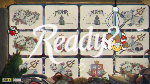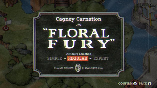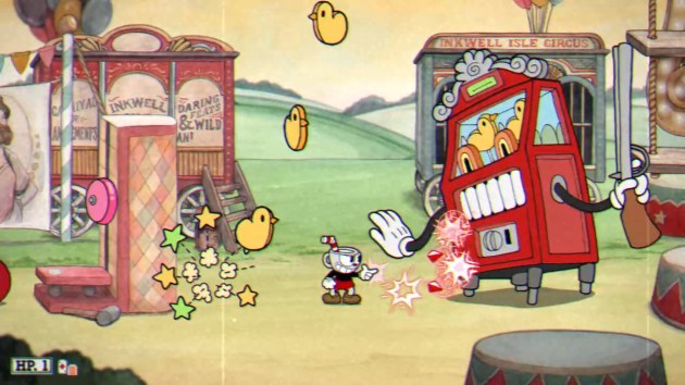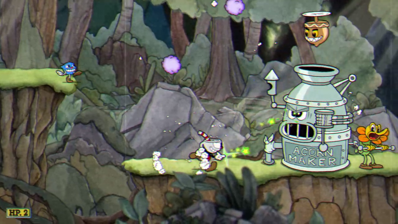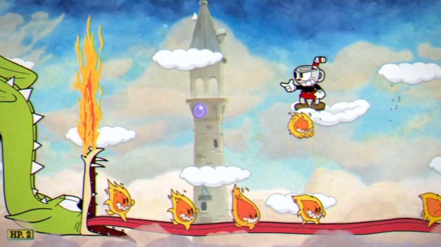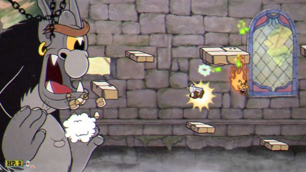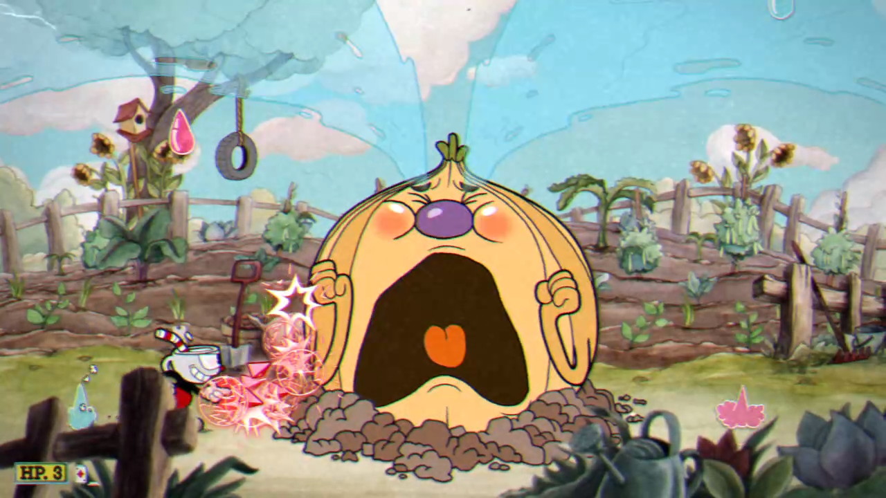 PHASE ONE – CAN OF WORMS: Werner scoots back and forth in his tomato can tank while either firing bombs at you or catapulting junk at you. The bombs must be avoided completely, and when they hit the ground, they explode in fire trails that go left and right. The catapult offer two projectiles that can be parried, though the position of the parriable objects is randomized. Eventually, he’ll fling two springboards out that you must parry to launch yourself off of in order to avoid his charge. This phase is so simple and basic, even on regular mode, that I can’t believe this is a world three boss.
