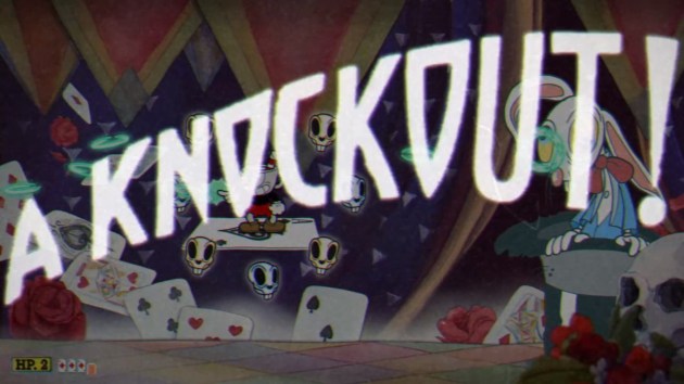 PHASE FOUR – JUST CALL ME ANGEL OF MOURNING: Sally takes a bow in one of the most difficult short phases in the game. Her parasol acts as a heat-seeking top that you have to constantly jump over, and all the while, an angelic Sally flies overhead, pumping her fists in gratitude while the audience throws roses that are lethal to Cuphead’s touch, though some can be parried. This phase is the same whether or not you took the secret path, but the background characters change. A pretty underwhelming conclusion to one of the more conservative, traditional-feeling battles in all of Cuphead. But one with no respect for personal space at all.