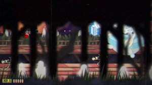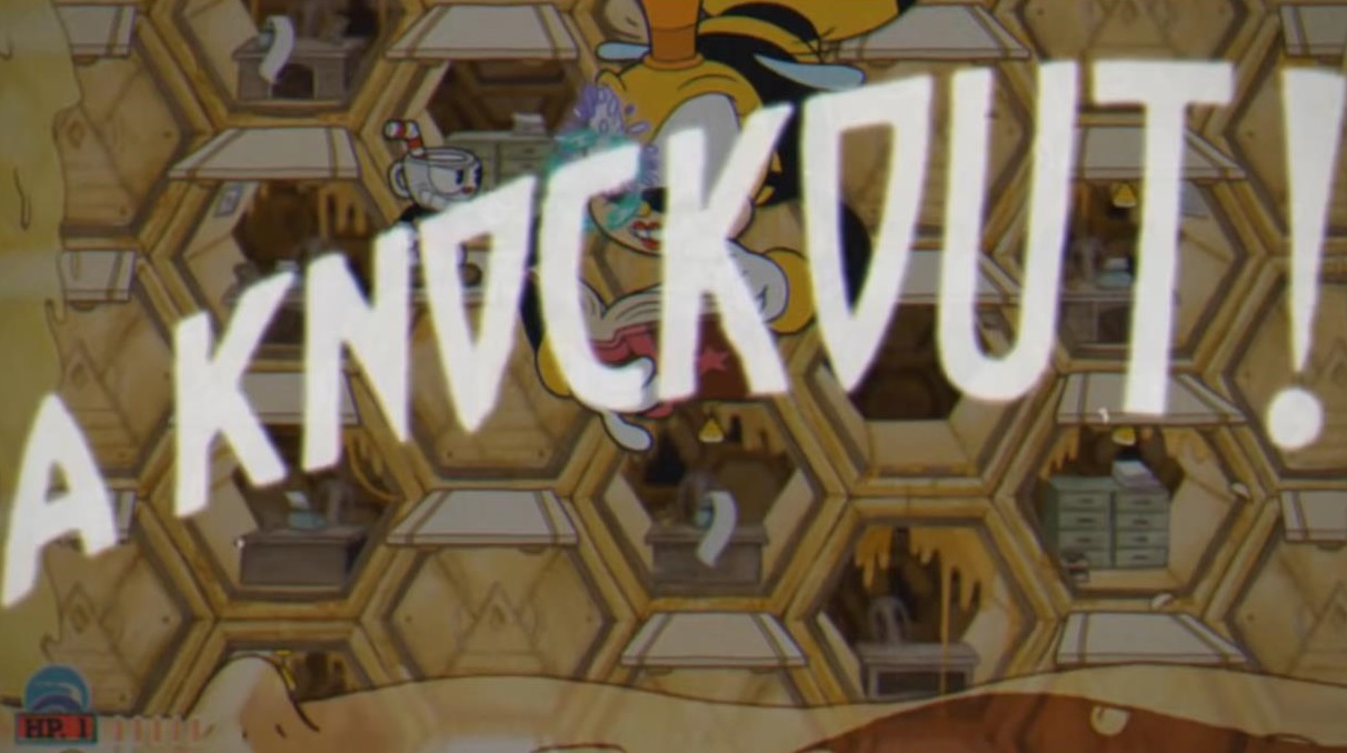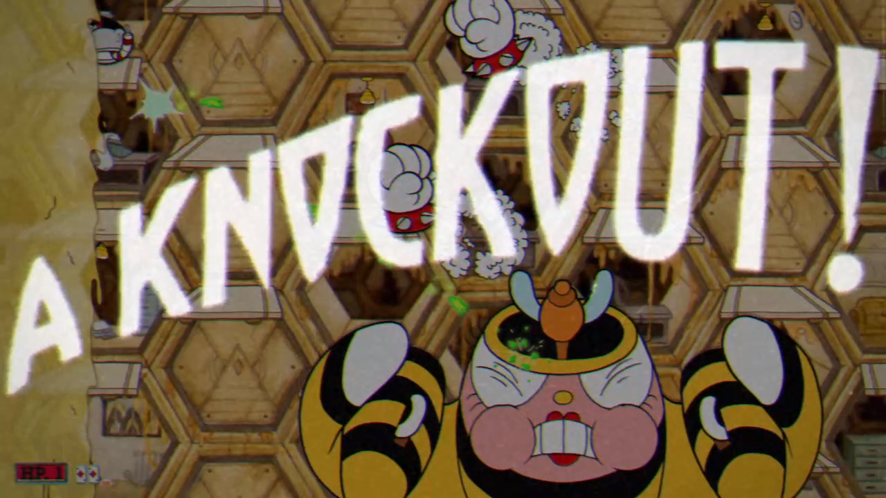 PHASE ONE – SECURITY BEE:Â The Rumor Honeybottoms fight presumably takes place immediately following the Grim Matchstick fight. That was a horizontal auto-scrolling battle. This one is a vertical auto-scroller, but with the same basic set of problems. The randomized platforms can absolutely screw you. In theory, they should keep you thinking on your feet. In reality: this is pretty much the most cramped battle in the entire game, which would make this difficult enough if it weren’t scrolling. But, the battle starts harmlessly enough. The idea of the security bee goes with the “bees as booming 9 to 5 business culture” that falls totally flat as this is one fight so busy you can’t take in the background. You have to focus on the platforms, since huge gaps in them will often appear, and all over. The gaps can even be in the dead center. Security Bee throws bombs that explode into six spikes. Half the spikes can be parried, but you have very limited space to do so. Worker bees also float by with suitcases, but they’re easily dispatched. This isn’t the worst part of the worst fight, so enjoy it while it lasts.