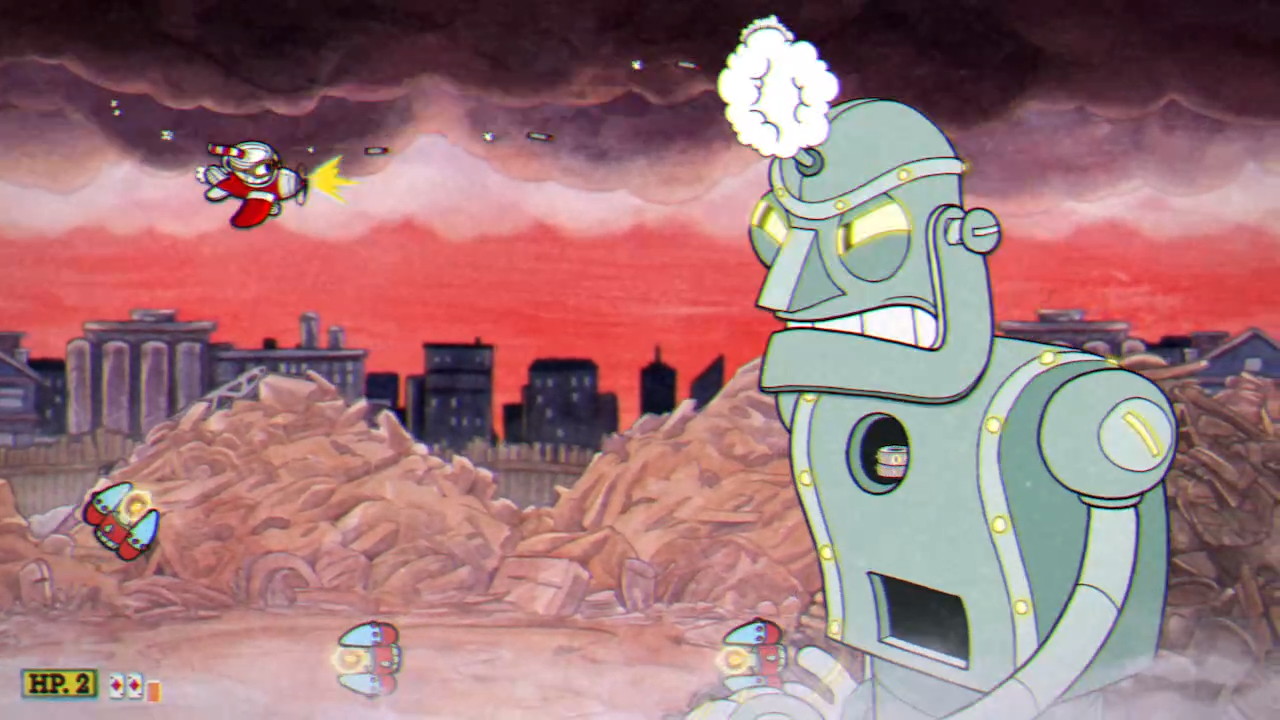 PHASE TWO – USE YOUR HEAD: The robot’s head flies off and will pass back and forth until you shoot it down. It’s one of the shortest boss phases in Cuphead (by design instead of by cheesing transition between phases like other bosses). While it can be a pain in the ass if you try to shoot it down normally, there’s an easier solution. By the end of the first phase, you should have a fully-charged power shot. Save it for this phase, position yourself directly across from the head as soon as you blow up the heart, and when the head launches, activate the big bomb. While it won’t take the head down instantly, you’ll only need a few more bullets to end the fun of Dr. Kahl’s robot and enter the worst phase in the entire game. Oh, and the belly torpedoes from earlier keep flying in at a faster rate. Do what I said and they’ll stop too.