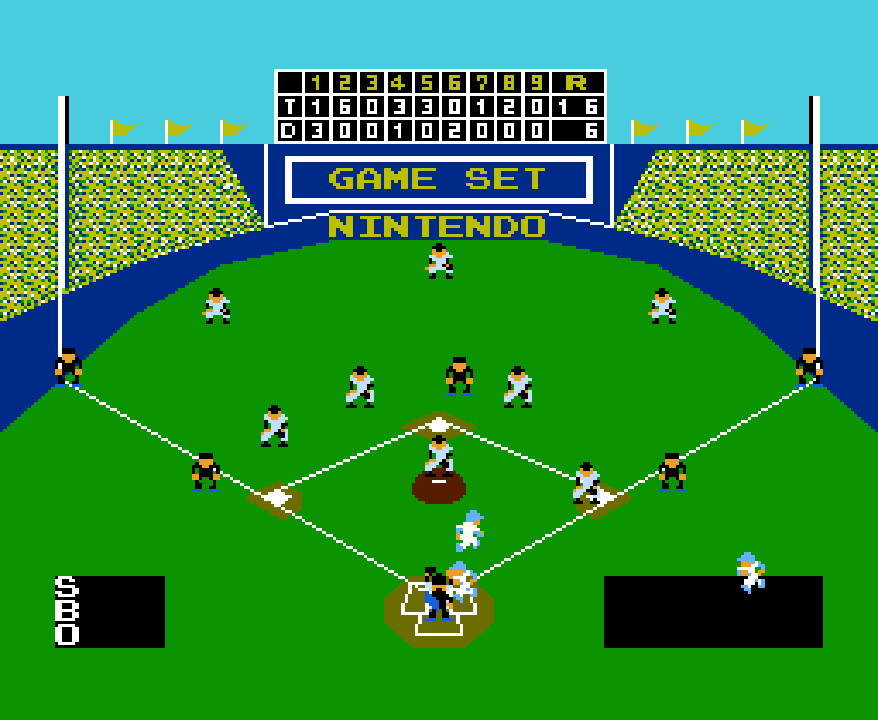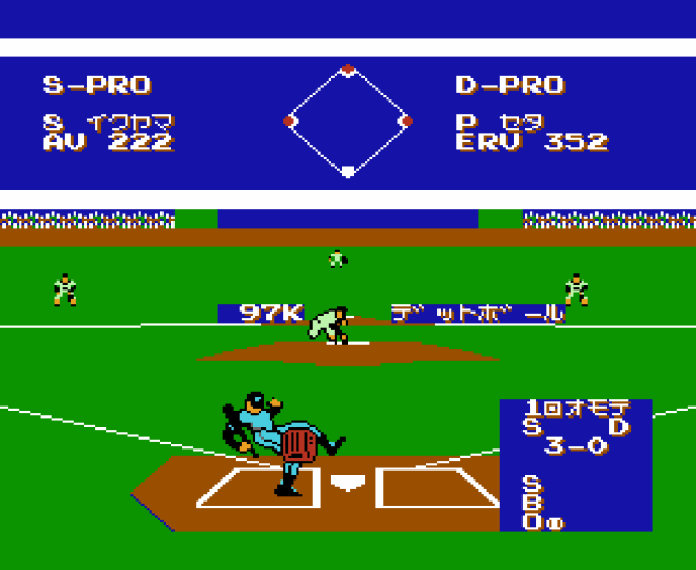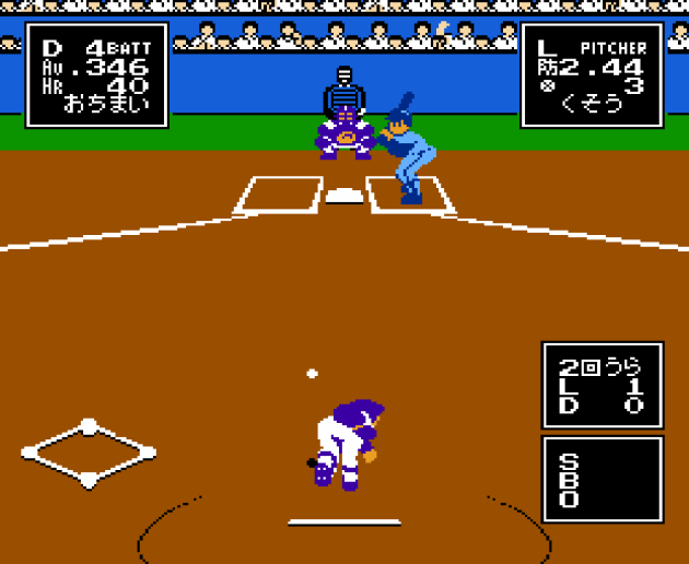 Super Real’s most stand-out feature is the illusion of a truly 3D game. For 1988 on the Famicom, it’s actually much more convincing than you would expect. When a batter hits the ball, the camera stays as far back towards the plate as it can while doing a television-like zoom. I had to double check with my guru Dave to make sure I understood how this was accomplished. It’s actually done using a pair of classic NES illusions: reloading an entire new screen while changing sprite sizes (pay attention to second base in the below clip) and having the background act like a matte painting. “When it ‘zooms’, it simply snaps to a different point for the camera. And the player sprites, ball and boundary action sell it,” Dave explained. Old tricks, but the classics are classics for a reason: they work, and Super Real does successfully create a sense of depth within a wide ballpark (with playfield dimensions modeled after, I kid you not, the brand spanking new-at-the-time Tokyo Dome). Take a look!