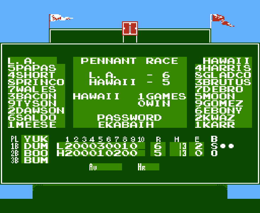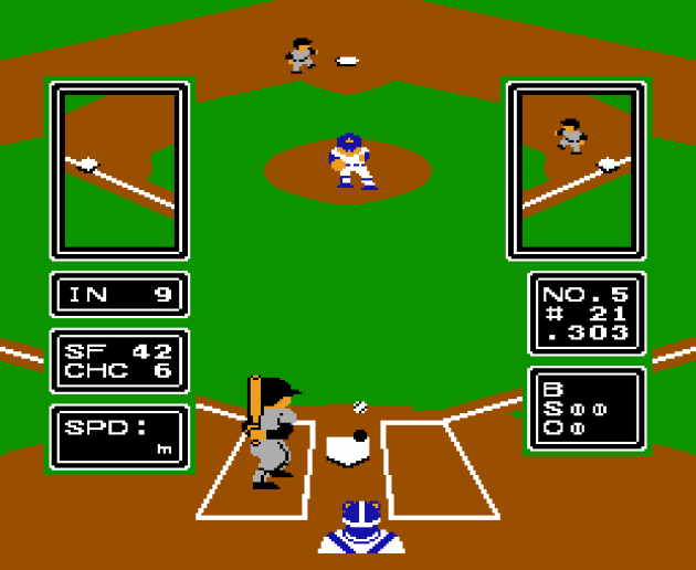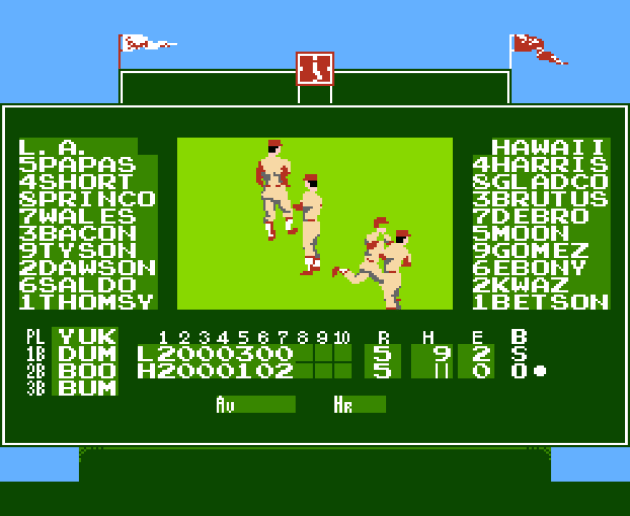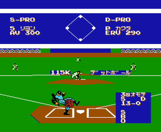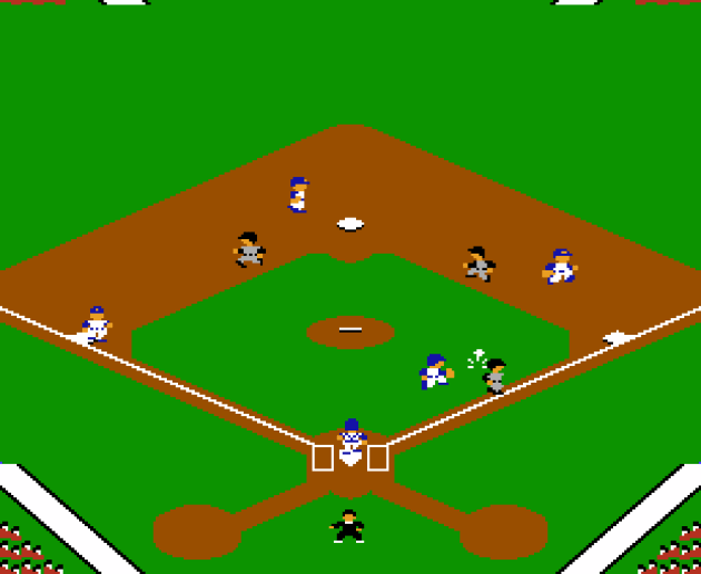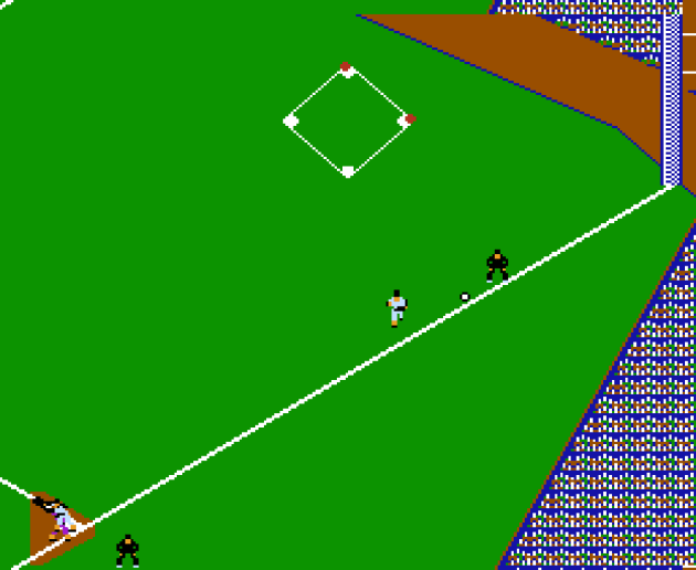 Unlike other games where you just have to align a player sprite with the ball sprite and the player sprite takes possession of the ball, here, you have to press buttons to do everything. Buttons presses to pick up the ball. Button presses to throw the ball, and another button for the basemen to catch the ball. So throwing out a chopper to the shortstop requires you to (1) move towards the ball (2) press the A button when the ball is near you to catch the ball (3) hold left and press the A button to throw to first base (4) press the B button to catch the ball with the basemen. This is double the steps of any previous baseball game I’ve reviewed, which is normally just (1) move to the ball until it touches your player (2) hold left and press the throw button.