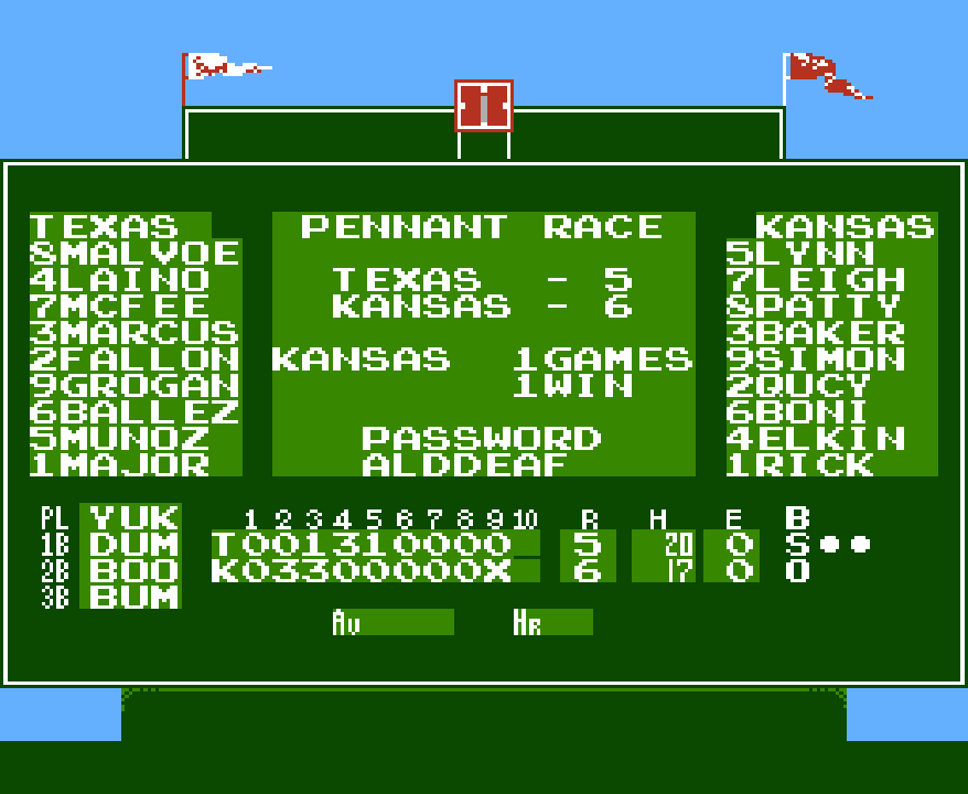 Since I’m focusing on single player experiences, the key addition to Taito’s take on the sport is a smarter CPU. It knows how to turn double plays, hit relay men, and make the throw to prevent extra bases. It also occasionally does the RBI Baseball “protect home when there’s an easy out at first” thing. It’s rare, but it happens, and it kills the immersion. I’m going to guess that none of these early 8-bit games will be able to perfectly keep up the fantasy for an entire nine inning stretch, so all I can hope for is as few bumps in the road as possible. But for what it’s worth, this feels like a step-forward, and the only reason I’m not calling it the best NES baseball game yet is because Bases Loaded’s duel is just much more versatile.