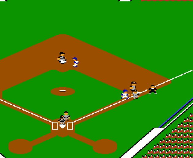 It didn’t take me very long in RBI Baseball to realize how easy it was to manipulate the CPU into chasing down a runner instead of getting the automatic out. You can’t do that in Bases Loaded. Here, the third baseman and catcher have caught my runner in a routine trap play. It’s not EXACTLY like real life baseball since the two defenders don’t (can’t) close the gap. They just throw back and forth until they get you from a stationary position. But, if it’s possible to fool them or inch your way back to the safety of the base, I never got the timing of it right. I tried, too. The next logical evolution of this leap forward is the defenders closing the space, so I’ll be on the lookout for that.