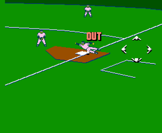 Basically, the person sliding has to also then stand up on the base for it to count as safe. Which would, you know, negate the whole point of sliding into a base in the first place. This applies to home plate as well. This time, it’s me getting thrown out. You can see, without a shadow of a doubt, I’m scoring here. I beat the throw and touched home plate, then the person catches the ball, then I’m called out, then I’m given the electric chair for the murder of the umpire. Okay, not that last one, only because I suppose Jaleco had to save something for the sequel.