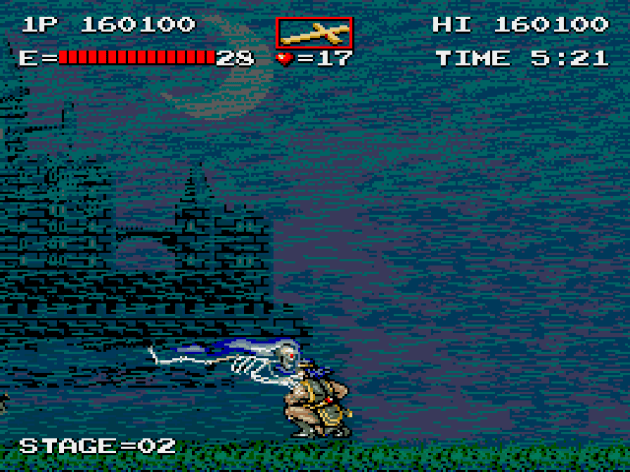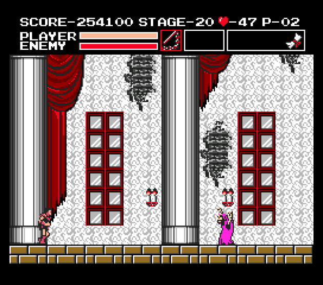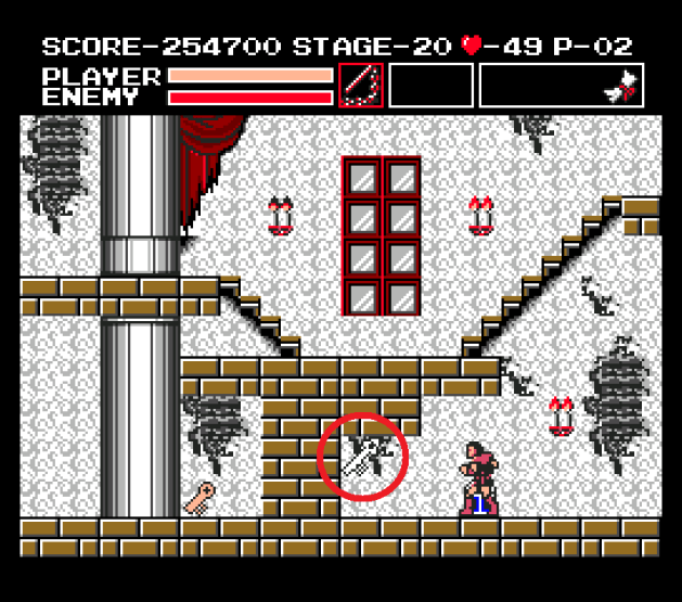 Ignore the “Stage 20” thing because this screenshot is taken from the second loop after I beat Dracula, but this is really the first proper stage of Vampire Killer.