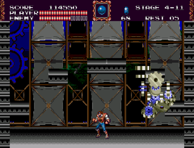 Like so many other ideas in the franchise, the World War I setting sounds exciting, but doesn’t really amount to all that much. Only the fourth level, which has a couple steel drums laying around, reminded me “oh right, this is a 20th century setting.” Not that you should ever play Castlevania for the story because it’s too silly to take all that seriously. But I guess I was hoping for something like the Grim Reaper driving a tank or Frankenstein (excuse me, “The Creature”) in a biplane. It feels like a missed opportunity, and it’s not like this game was afraid to embrace the comically absurd silliness. One of the bosses is a downright playful set of sentient gears that I’d swear is more like a boss from a Toy Story game.