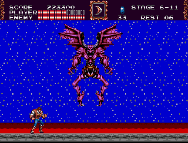 Boy, did I lose my sh*t on this part, because my up-to-this-point perfect run ended because I went right instead of left before the screen scrolled up enough to show me I was going the wrong way. I’m certain that I’ve played Bloodlines all the way through because I remembered certain aspects of the Grim Reaper and Dracula battles, but for the life of me I couldn’t remember any of the levels, even though there’s a couple spots that seem memorable. I’ll chalk it up to the bug zapper in my head.