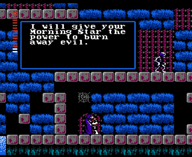He also added more invincibility frames (what I normally call “blinking”) and the ability to jump off stairs but I didn’t even realize that and never used it until after I’d already beaten the game. Those are the only real efforts towards rebalancing I believe bisqwit did, and he also added a save system to replace the password system. Finally, the dialog is properly translated. Apparently some characters are meant to lie to Simon and provide red herrings that aren’t helpful to players, and I have no problem with bisqwit not changing that. He stayed true to the developer’s intent, whether that intent was stupid or not. The clue books you find in the mansions are much more clear, and you can go back and re-read them in the menu. Even the sign posts are better handled. Here’s some examples of the new dialog, which is based directly on the original Japanese text: