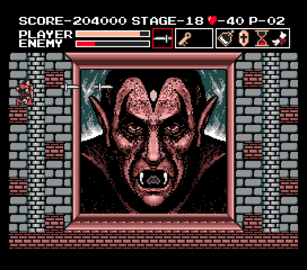 This final lead-up to the Dracula fight is so embarrassing. It’s just a typical collapsing bridge sequence, maybe the longest example of this trope ever done in a game like this. You cannot stop to fight all the bats that are spaced out along the way and eventually have to accept a few life slaps. The collapsing bridge trope ALWAYS gets my heart racing, and it’s a damning indictment of how bad Haunted Castle is that it takes one of my favorite gimmicks and runs it into the ground so badly that it becomes boring AND THEN IT STILL KEEPS GOING! By the way, this is the ENTIRE final level of the game. It screams “we have no clue how to feel climatic!”