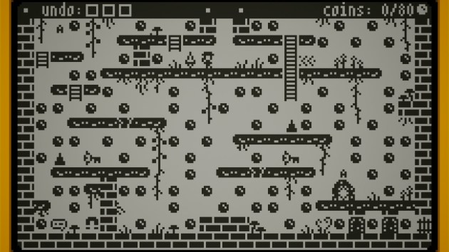 This is especially true thanks to the graphics looking a bit like Game Boy and a bit like Playdate. The previous Elena Temple was themed around a game by a hapless game developer who kept making their flagship game for the wrong platforms. This time around, it’s more like “hey, remember Game Boy?” You can zoom as far in or out as you wish. I needed to zoom all the way in, but your mileage may vary. The object is to collect all the coins and then get to the exit. The big twist is that most rooms have an item that grants you the ability to undo your previous fall from a platform, only you get to keep any progress you made towards the whole coin collecting. It’s actually a pretty good twist, but it’s also one that puzzle aficionados should be able to reverse-engineer with only a bit of trial and error. It’s intuitive to use, at least. The amount of falls you’re able to undo varies from room to room, and each fall is numbered so you know where the undo button is sending you. It works wonderfully and it does make for a fun gimmick. In fact, it’s so fun that I was sorry when it wasn’t in a room.