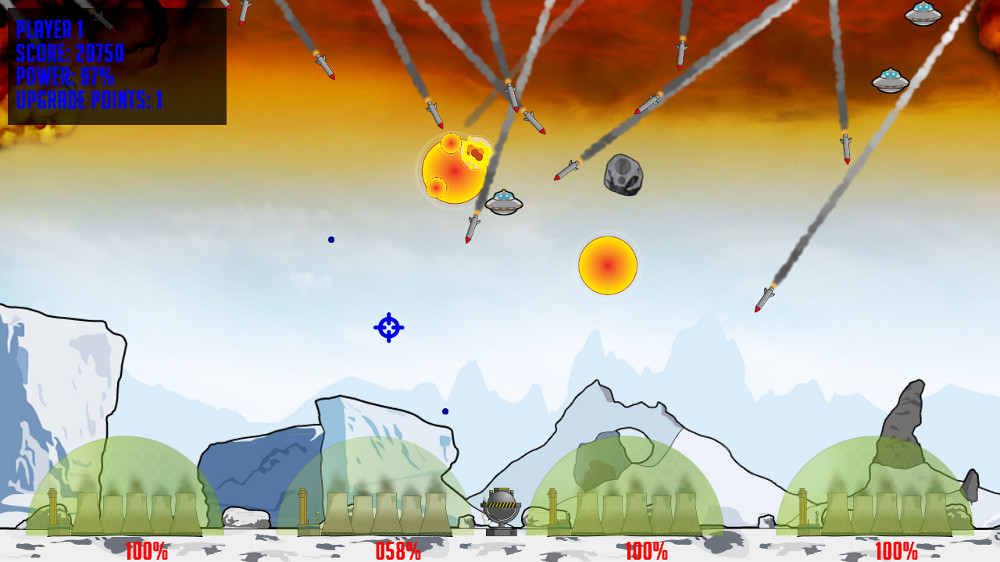 So what can you do with a modern take on a classic game that appeals to fans of the original while appeasing people of my generation that don’t give two squirts about nostalgia? Well, improving the formula is a good place to start. Alien Siege does that, by giving you upgrade points you can spend to improve the launch speed of your rockets, the firing rate of them, or to improve your gun. Instead of just intercepting missiles, you also have to fire on UFOs and meteors. Missiles don’t work on them, so you have to split your time between intercepting enemy missiles with one button and fighting everything else with another button. It sounds like it would be too much to juggle, and it is. But in a good, old-time arcadey way.