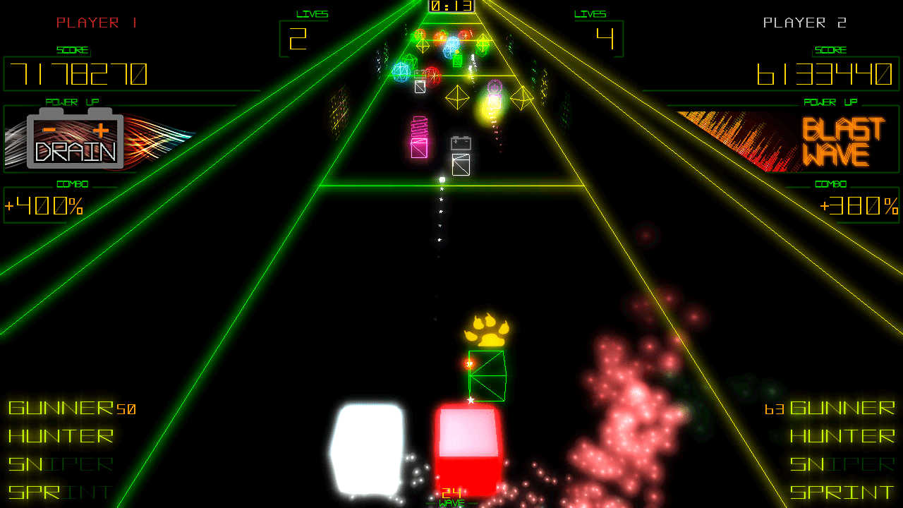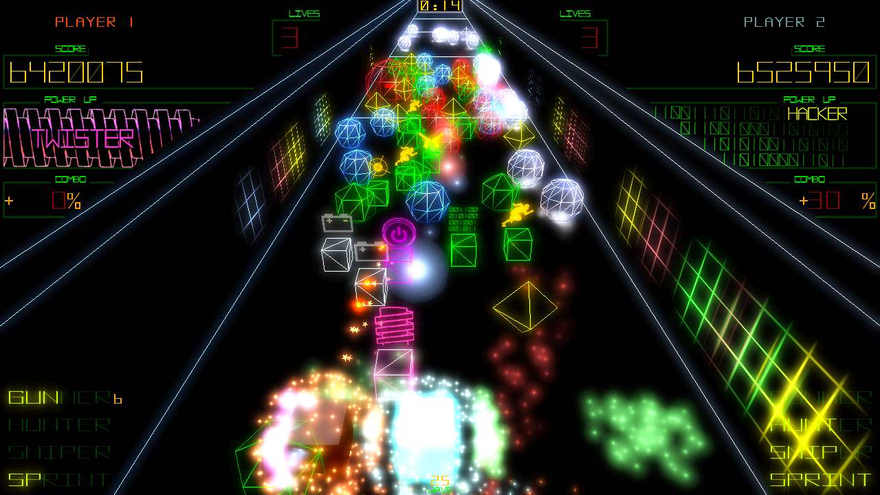 There’s two modes of play. Arcade ends after twenty-five waves, while Survival has you fight multiple “boss” orbs that shit out little baby orbs until you run out of lives. Both modes can be played in a competitive mode, where you “work together” wink nudge while trying to kill each-other by grabbing controller-jamming power-ups. Actually, most of the items in this game are pretty cool and practical, and learning how to best use them feels rewarding. Early on, I figured the laser was the best one of have, but as enemies pile up, it can get pretty dangerous to use. The freeze item works better because it allows you to shoot at enemies and rack up a higher combo.