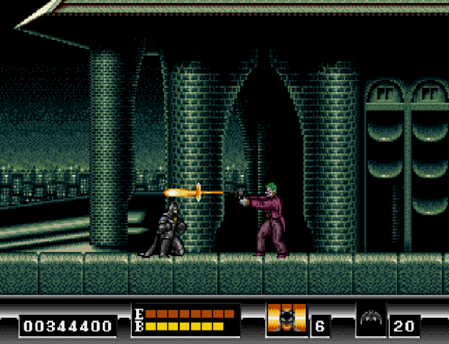 I actually had to rewind to get a screenshot of the Joker shooting at me. The first time I played the last boss, he barely got a chance to run on the screen, as I all but stun-locked him with my batarangs for the easiest last boss victory this side of Shredder from Ninja Turtles.