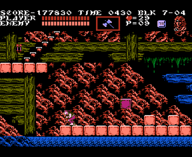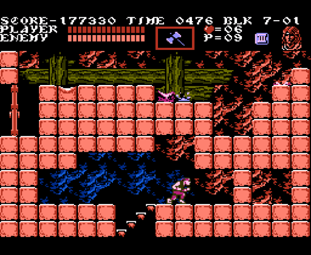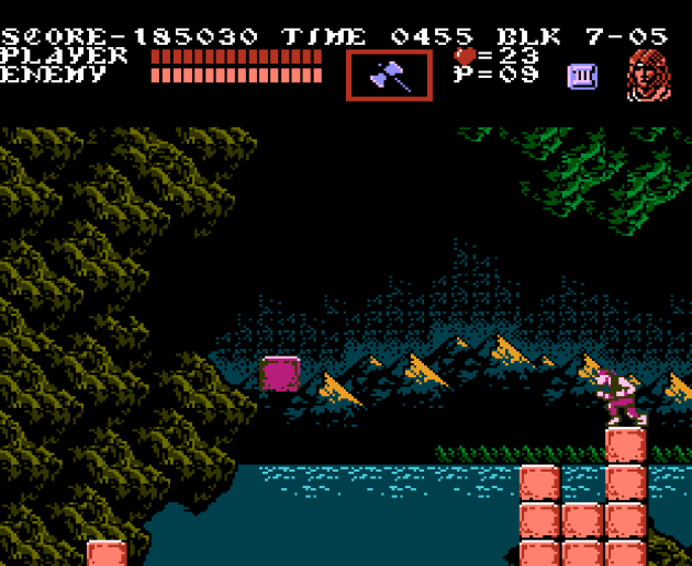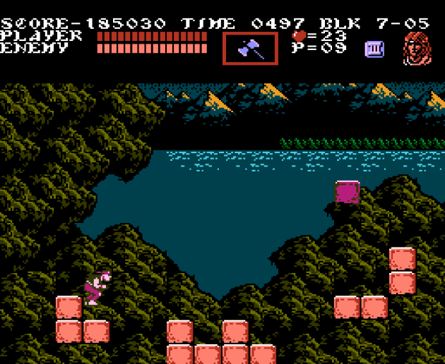 The most underrated aspect of Castlevania, IMO, is that it’s a milestone in settings and set-pieces. Like right here, where the location of the final battle with Dracula can be seen off in the distance. Even better is this comes at roughly the halfway point of the game. Video games didn’t typically do one-time backgrounds just for the sake of world building in 1986. Ultimately, a game designer is trying to create the illusion of an entire world out of a series of 1s and 0s. Castlevania’s world is more real than just about any franchise that got its start on the NES, including Super Mario, Zelda, and Metroid. It’s head-and-shoulders above them, in fact.