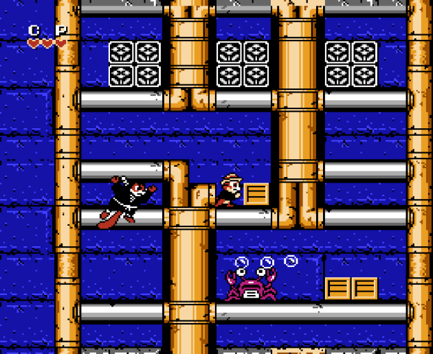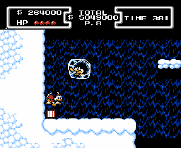 The other cars will bump you and provide a nuisance, but as long as you stay on the track, it’s pretty hard to die. The only parts where I came close were narrow docks and one section that has a bridge that you have to wait for to reach you. Surprisingly, if you don’t deliberately skip the jumps to scoop-up the stars, the Autopia actually is pretty fun. The jumps are exciting, the course layout is well done, and it’s satisfying to bump an enemy car off the road. The biggest problem is, like the other stages, it’s all over with far too quickly. I sort of wish the formula here had been removed from this game, then expanded into its own full game. I enjoyed my time with it enough to see the potential there. Oh, and you can replay it to bank stars until the cows come home. So play it once for fun, then come back to it if you’re struggling with other stages to bank currency. I’m just kidding. You won’t be struggling. The platform levels are a cinch and this whole game can be finished in about thirty minutes. Yea, this is one of Capcom’s shortest games, and it’s not all brilliant like DuckTales was.