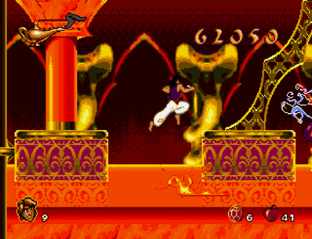 See?! That’s ridiculous. But that kind of design is all over Genesis Aladdin. Now, I’ll concede that the game had a short, very rushed development cycle. Fun story on that: it was originally going to be made by BlueSky Software. There’s an irony there: BlueSky was who Sega gave the Joe Montana football series to after their original choice, a company called Mediagenic (who was the linear continuation of the Atari 2600 era Activision) lied to Sega about the progress they’d been making on the game. Sega had Electronic Arts finish the first Montana game while actively searching for who would do the remaining games on Montana’s contract, and BlueSky got the call. Years later, Disney and Sega were so unimpressed with BlueSky’s work on Aladdin that they turned to Virgin Games with 99 days to go before the game had to be finalized in order to be manufactured and ready to launch alongside the VHS release of the Aladdin film. Why? Because 10,000,000 flyers for the game had already been printed and would be included with the home release of the Aladdin movie.