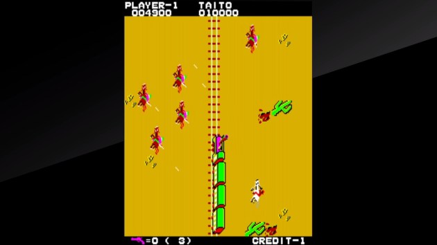 Wild Western takes the rotary controls from Front Line and applies them to a game where you bobble back and forth on horseback shooting train robbers. The train is part of the playfield and bullets ricochet off it. That I was able to pull off, successfully angling bullets off the train and onto the baddies. It wasn’t remotely satisfying, but hey, it’s something. What I couldn’t do regularly was hop onto the train when the bandits boarded it. I kept.. well.. dying when my horse brained itself on it. When you clear the enemies out, you do the worst bonus stage I’ve ever played then start another stage. Unlike Front Line, I didn’t think the controls carried over well to the home port, and frankly, I don’t think Wild Western ever had potential as even a decent game. It’s actually stunning how little game is here, though at least the coin-op had the attraction of a novelty controller. That wasn’t part of the home version. Many of my lives in Wild Western lasted as long as it took for the enemy to fire their first bullet. As the final game in this set, Wild Western hammers home that Taito Milestones 1 is the collection of games not good enough to buy alone. Verdict: NO!