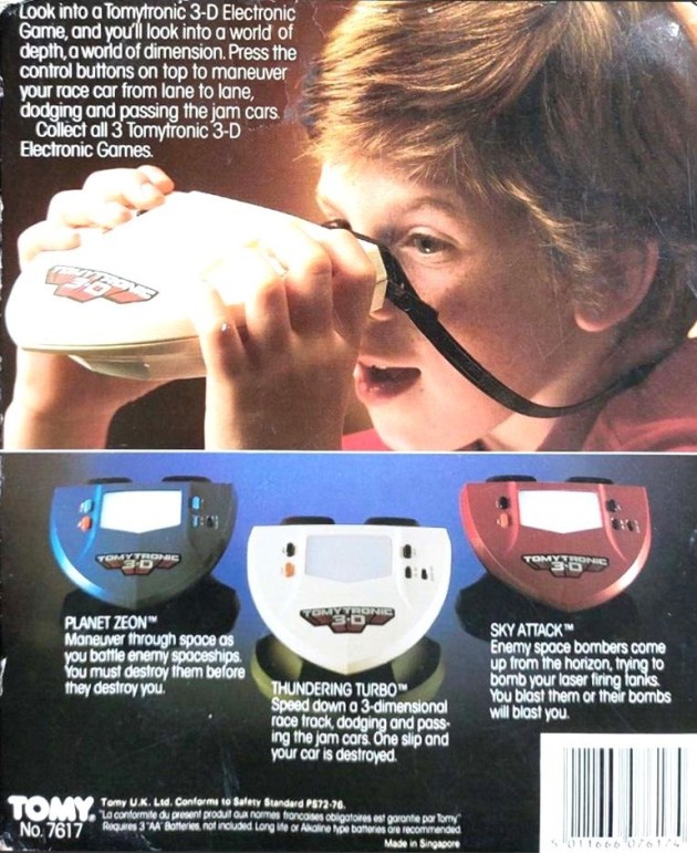 Really, you can call this “Traffic Jam: The Game” and it works. Races last 100 seconds, and each lane has a specific speed for the enemy cars tied to it. The right lane is slow, the left lane is fast, and the center lane is somewhere between. You have to use this to open up a clearing for you to pass cars. You get three lives per race (it resets between each race) and I found myself actually caring about what my score was. Even without the 3D to lift it up, at least Thundering Turbo has an interesting scoring system. It’s one of the few LCDs where you lose points sometimes. The scoring system sees you get one point for every car you pass, but you LOSE a point if you get passed. This is also one of those rare times where I don’t feel bad for kids of the early 80s who got this from Santa Claus on Christmas morning. This is genuinely a very good game, and one that I sorta want to try in 3D. Even if I can’t imagine how uncomfortable it must be to play a video game built into a pair of cheap plastic binoculars.