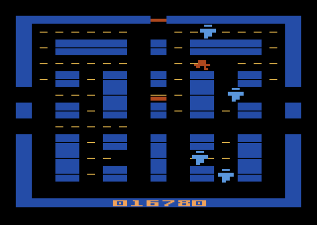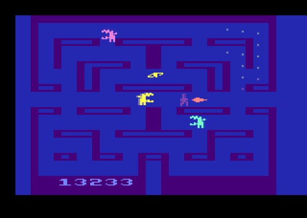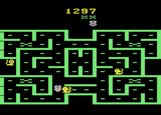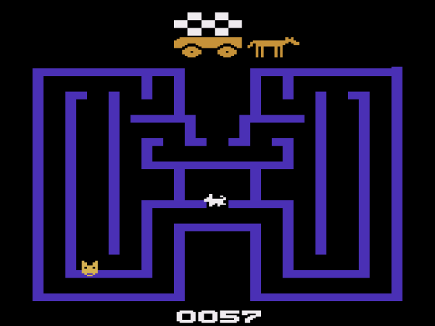 Mouse Trap comes with a reputation of being one of the Atari 2600’s best maze chases, and I don’t get it at all. It’s the typical Pac-Man-like “rack up dots” game with a pair of twists, and the best thing I can say about it is that this is one of the better jobs of merging two functions into one button on the Atari 2600. There’s gates scattered throughout the maze, and there’s Xs that are supposed to represent dog bones. By holding the action button next to a gate, you open it and change the shape of the maze. The whole maze, and not just the individual gate. Tapping the button uses one of the dog bones you’ve collected and turns the mouse into a dog, effectively a power pellet that allows you to eat the cats. It sounds fine, but there’s only one maze, and it’s completely lacking in tension. Even with the difficulty adjusted to make the cats faster and smarter, they still posed no threat. Why? (1) There’s only three of them. (2) There’s four dog bones every round. (4) You bank the dog bones, to use whenever you need. I’ve never played a maze chase where the overwhelming advantage belongs to the player as much as Mouse Trap 2600. Consequently, it just isn’t fun at all. It’s fish in a barrel. It also doesn’t come remotely close to the complicated Mouse Trap arcade game, which had three different colors of gates and a lot more grit. This isn’t a port so much as a full-frontal lobotomy of it.