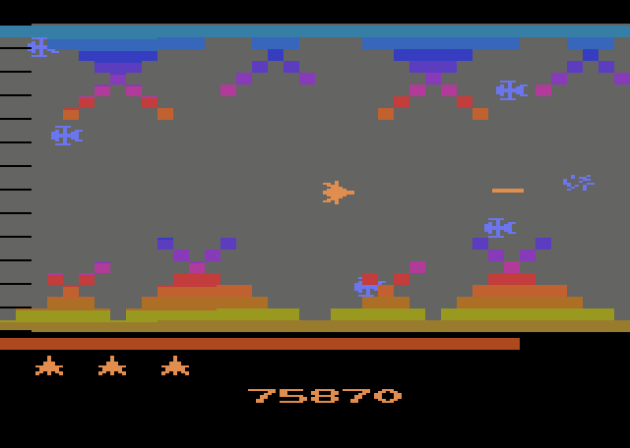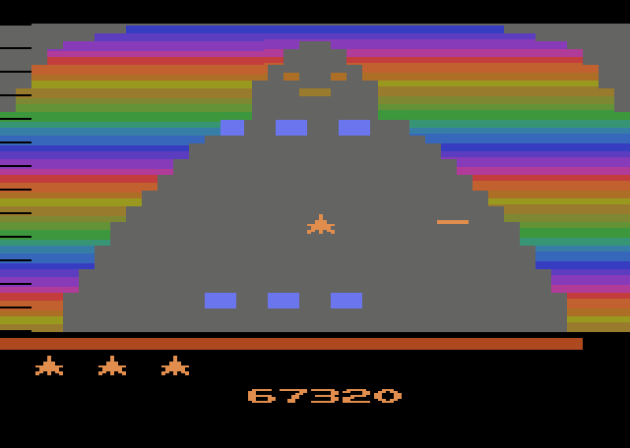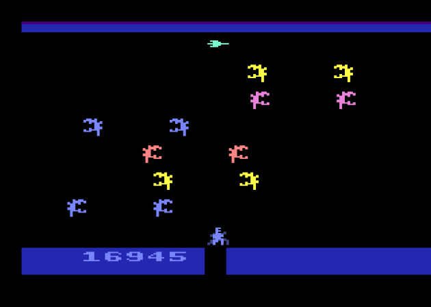 In the arcade, you can shoot in four directions. They carried that over to the Atari 2600 game despite a control not remotely suitable for it. You don’t need to even really press the button to shoot in the port. Just wiggle the joystick and you can shoot in four directions. OR, if you don’t like that, you can adjust it with the difficulty switches on the console. I used the default setting and I thought it worked surprisingly well. It helps that the combat is very satisfying. There’s a nice variety of enemy waves, and the game has actual levels, not to mention a whole other game world that plays much faster after you beat the boss.