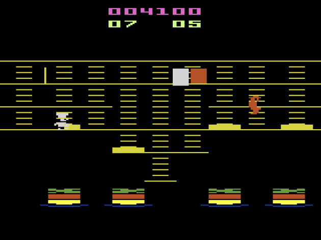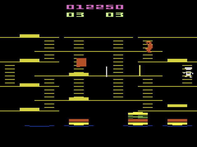 If there’s one game from the Golden Age that consistently confounds me, it’s Burgertime. It sure seems like something I should love, since it’s such a layered game.. no pun intended. It’s a maze chase that thrives on close-calls and near misses, which is that sweet spot I crave so much. Additionally, no maze chase incorporates the “turn the tables” style of gameplay into the actual pursuit better. The closer you keep the enemies to you, the more likely you are to take them out when you drop the burger parts. I should LOVE Burgertime, but I never have. I don’t hate it or anything, either. It’s just never been one of my favorite games. After multiple attempts across multiple platforms, I’m still waiting to play one where I don’t spend most of the play session frustrated by the movement physics. It’s those damn ladders. No matter which port I play, I’m constantly getting hung-up on them. So, it’s not like the Atari 2600 version is uniquely problematic.