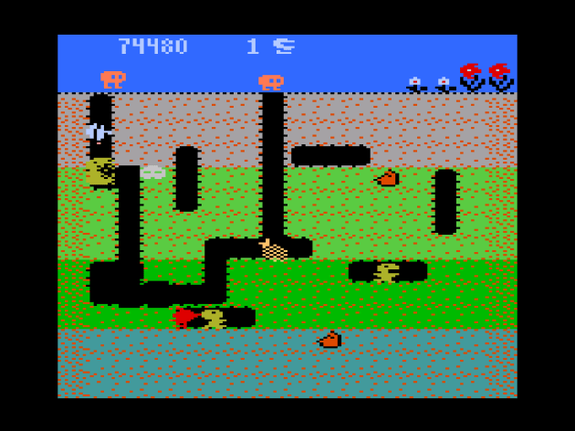 Like many of General Computer’s Atari 2600 efforts, Dig Dug is actually impressive, given the limitations. If you were a fan of the coin-op and had an Atari 2600, you were in luck. I mean, look at this! Sure, the dragons look more like obese toads and it’s nowhere near as satisfying to burst the enemies. There’s no death sprite, so enemies just vanish when you explode them. But, it’s still Dig Dug. It even does the bit where if you stand right next to a teeny-tiny sliver of wall, your hose can pass through to the gap on the other side, just like in the arcade. So, what’s the problem? Well, Dig Dug 2600 is a completely toothless experience. It took me a while to figure out why. I had to keep swapping back and forth between the arcade and VCS versions. I believe the game is nerfed because, on Atari, enemies have fewer frames of inflation. The Atari 2600 version only has two, while Dig Dug Arcade has three (four counting the final explosion) so when you attack, enemies can die much faster. That one extra frame means it doesn’t matter if enemies gang-up, because you can still kill them much faster, even without the multiple-pump trick. Plus, they’re not aggressive enough, and the only adjustable difficulty is to make the game even easier with the kid’s mode. It’s always better for a game to be too easy instead of too hard, but Dig Dug 2600’s total lack of tension and challenge makes it a bore.
