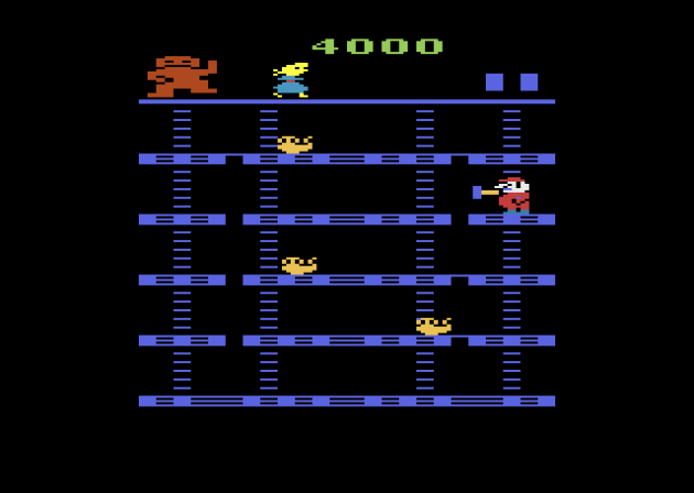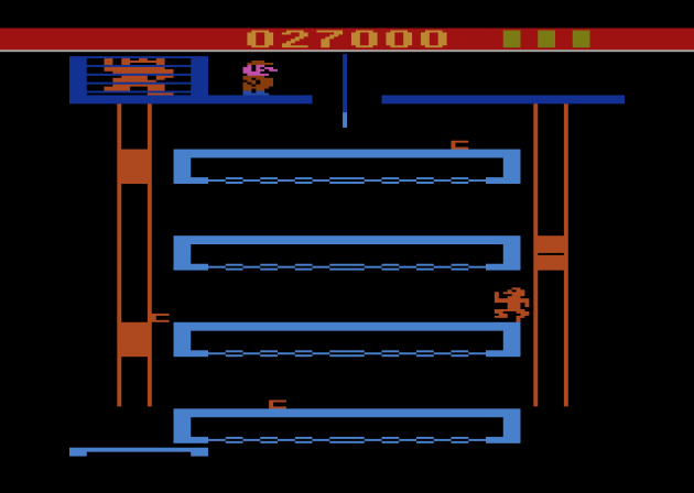 Okay, so I might have made the Cookie Crisp story up, but making up stories about Donkey Kong for the Atari 2600 seems to be the order of the day. The long-standing urban legend is that Garry Kitchen was under strict orders from his bosses at Coleco to make a less-than-quality Donkey Kong game in order to make the more authentic Colecovision DK pack-in more desirable. This legend actually evolved from a prior legend about the Intellivision port being sandbagged. Neither is true. Now, in the interest of full disclosure: Garry is one of my favorite people and a good friend, but that doesn’t factor into this review at all, as I’m sure you’ll guess from what my verdict is. But, having gotten to know Garry and learn about what went into the making of Donkey Kong, he has my sympathy. This is a historically villainized port, and I don’t think it deserves to be that. While sympathetic gamers of all stripes bend over backwards to excuse E.T. on the grounds of having an unreasonable production deadline, Donkey Kong 2600 (as well as Donkey Kong on the INTV) had deadlines straight out of a nightmare too. And, given the circumstances, I think it’s impressive that the final product doesn’t feel like a cheap bootleg of the advertised game, like Atari’s Pac-Man did.