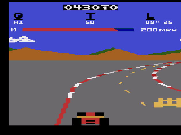 For those who think I hunt these games for sport, trust me, I don’t. In fact, I feel pretty awful doing this review. If I had known zero about the Atari 2600 but retained all my arcade knowledge, and you provided me with a list of coin-op translations on the platform, I might have guessed Pole Position would be the one that suffered the most on the journey home. Before I fired this up, I predicted “there’s no way the sense of speed was retained. None” But, it’s actually here. In fact, the feeling that you’re in a car that’s zooming down a track is so strong that I was genuinely stunned. Completely, utterly stunned. It’s also really kind of smart how they handled having only one button: the gas is just automatic. Yea, really. Up and down shift gears, while the action button handles the breaks, and as my Dad said, “maybe that’s a smart idea, since you actually remembered there was a break and you could use it. There really is a first time for everything!” He’s such a delight. It’s a really impressive technical feat. Pole Position 2600 IS missing the billboards that you crash into if you go off the road, and the rival cars are ugly yellow.. things, but this looks and even feels like the arcade Pole Position. I couldn’t believe what I was seeing. It was one of the biggest surprises of this entire Atari project I’m doing.