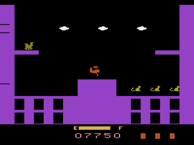 Sky Skipper consists of two short stages with “enemies” that don’t move. Drop a bomb on one of them to temporarily knock it out, then fly over to the chambers where animals (replacing the playing cards from the arcade game) hop up and down. You don’t stop moving, and if you hit a wall or run out of gas, you die. You’ll mostly die from crashing into the walls, but that’s literally the only challenge. Dodging the clouds that spawn after one cycle of the two levels is a cinch, and since the gorillas don’t swing at you, throw stuff at you, reach for you, jump at you, or do anything besides try to bore you to death, gameplay consists of dropping a load on them, grabbing the three animals that hop up and down, and parking yourself above them and flying back and forth while you wait for it to respawn, since you probably won’t have enough time to grab all the animals before they wake-up. With each cycle, your speed increases, which actually works to your benefit, since you can scoop up more of the freed animals in every bombing run. In my Sky Skipper arcade review, I said Sky Skipper 2600 seemed fine, but I admit, I only played it for about a minute. it wasn’t the focus of the review, and in 2019, I wasn’t exactly an Atari expert. I still ain’t, but having put time into this now? Wow. Yea, bad. Bad bad. Everything interesting from the arcade game, including the complex scoring system, is gone. There are many adaptations on the VCS where I jokingly say “I can’t believe this exists” but with Sky Skipper, I can’t believe this exists. If the game has sentience, I’m guessing it wouldn’t believe it, either.