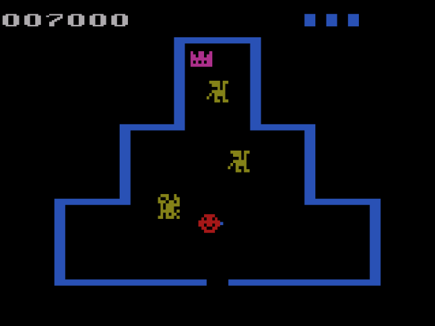 Venture is sort of like Berzerk with an actual point and stuff to do. There’s two levels, each with four rooms. You start on an overworld and have to dodge Space Invaders-looking enemies while you make your way to the rooms. Once you enter the door, you’re placed in a room with three enemies (except in the picture above, where there’s moving walls to dodge) that you have to either shoot or dodge. The rooms have a treasure that you must get and exit in a timely manner. If you take too long, a dragon appears and tries to kill you. It’s actually genuinely startling when it appears. A lot more frightening than the evil emoji from Berzerk. Once you get all four treasures, you move to the next level. After two levels, the game cycles up in difficulty and you just repeat the process until you run out of lives.