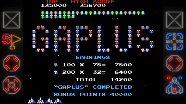 In Gaplus, the “challenging rounds” (aka the bonus rounds) are different. This time around, you have to juggle three waves of enemies, not shooting so fast you knock them off the screen. Once I got the hang of this, my scoring average cleared 200K easily.