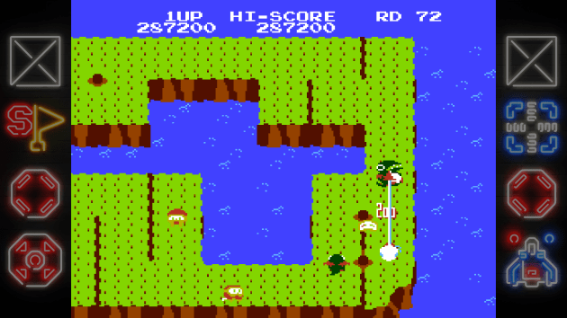 Dig Dug II retains the original game’s harpoon mechanics, including the ability to more quickly burst enemies by throwing it repeatedly instead of holding the button down. The key difference is there’s no tunneling, which means enemies can walk freely. The hook this time is you can use a drill along pressure points that’ll create cracks on the surface. If the cracks completely encompass an area and connect with other cracks, the section with the least amount of land will collapse into the water. Any enemies on that land will drown for extra points. There’s only so many pressure points in the stages, and not every stage lends itself to the destroy-the-Earth gameplay. Admittedly, it’s fun and different. Enemies will not physically walk over the cracks and instead use their “turn into faces and teleport” mechanic. The fun in Dig Dug II is wrangling as many enemies as possible into an area before collapsing it into the sea.