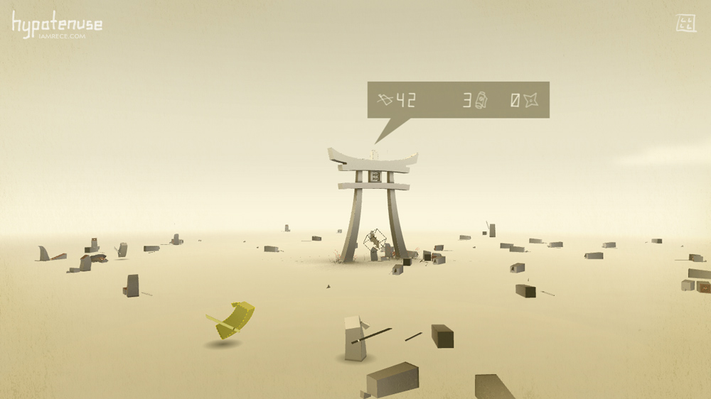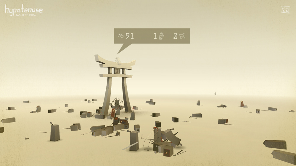 By the way, the above paragraph was a total waste of time. Hypotenuse is just a hack & slasher where waves of katana-brandishing baddies run at you and try to perform subtraction on your body, with the apparent hook being that everything is a rectangle. Enemies run at you, swing at you or throw a ninja star. The animation is smooth, the play control is good, and overall Hypotenuse is a well made game.