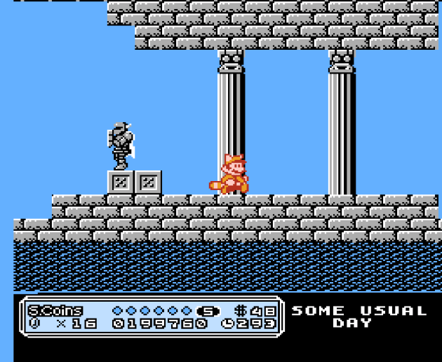 And it does manage to bring the clever occasionally. Like, one stage will start and you’ll immediately see coins arranged to spell-out GO! and you’re like “huh, what’s that about?” And then you see a sign post that says “HURRY-UP, MARIO!” and you look at the timer, and it’s already down to 90 seconds. “Oh.” AND IT WORKS because the level is designed as an intense maze. Great! Love it! Whereas Super Mario Ultimate wowed me with a mad scientist vibe, the level design of Some Usual Day feels almost scholarly, as if designed by the best student in Level Design 101. Nothing too radical or experimental, but just flawlessly designed and paced stages that highlight what a terrific game Mario 3 already was.