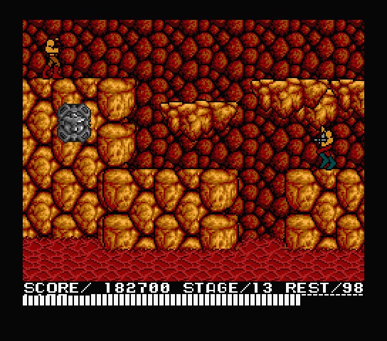 See the key? You can’t jump up and get it, even if you have the item that lets you jump higher (which I don’t even think is located in the fourth level anyway). See the blocks in front of the skeleton dragon? If you break those before you get the key, you’re in BIG trouble, because now you have no way to reach the key. If the dragon is already dead and you break those blocks, you have soft locked yourself. The game is over and you have to reset from the beginning. If the dragon is not dead, you have to damage yourself using the dragon in a way where you pop upward and collect the key using the knock back, but it’s nowhere near as easy to pull off the knock back trick in the MSX game as it is in the NES game.