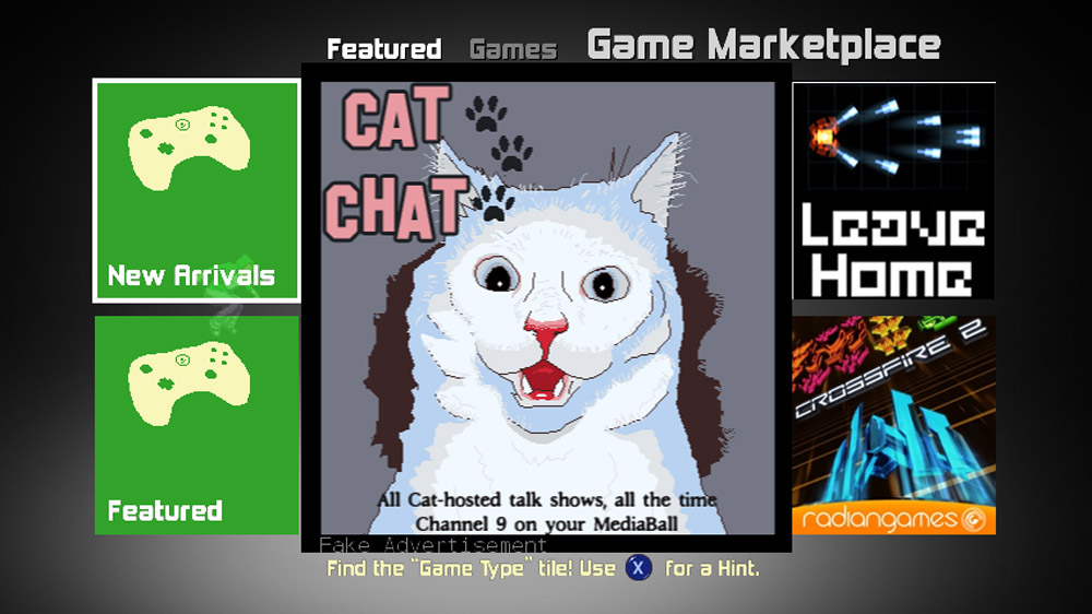 So the idea is you start in a mock-up of the Xbox dashboard. You have to “find” the actual game here. Along the way you’re bombarded by stuff not related to gaming at all. Which is what Microsoft intended the Xbox to be from day one. It was Microsoft’s Trojan Horse. Gaming was just the entry point, because making a console was cheaper than acquiring a cable provider, or a telecom company. No, really! That was the point.