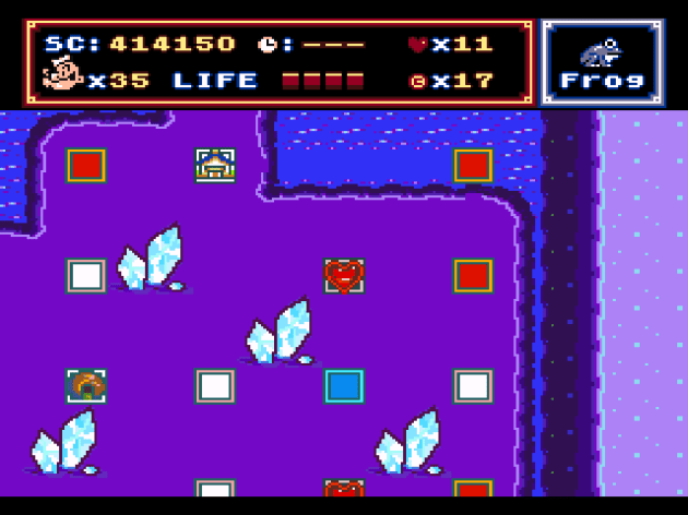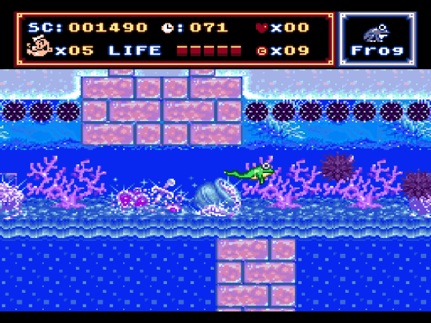The third power-up is a frog that basically copies the Frog Suit from Super Mario Bros. 3 in that it makes swimming faster and easier, except in this case, it turns you into an actual frog. This works great for the underwater levels, of which there’s a lot. It also allows you to fit into small spaces, though most of those are in underwater levels. The downside is that, when you’re a frog, it’s one hit deaths no matter how much life you have left. Also, it seems glitchy as all hell, as sometimes the level would stop scrolling up or down while I was using the frog, and I had to turn it off (thus losing it) in order to proceed. This doesn’t seem like it was intentionally done, as there’s nothing in the level design that logically indicates I’ve reached any sort of cutoff point. It just sort of blocks you from continuing. The other power ups nuke the enemies that walk around the map, and I hate them because they TEASE a fun thing. Like one anchor says ZAP and has a lightning bolt. You think it’s going to be some kind of electric mega-charged whip that shoots sparks or something. Nope. When you activate it in a level, a little window opens up that shows a random mini-boss getting nuked. But they come back quickly, so, like, what’s the point?