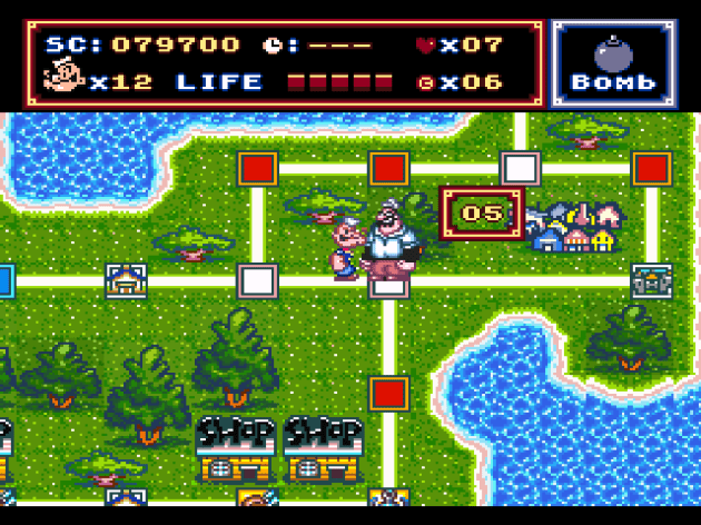 As for the actual level gameplay, SFC Popeye is as generic as platforming gets. Most enemies can be killed by jumping on their head, but you also use an anchor tied to a chain as a whip. It’s satisfying enough. Whips are fairly bulletproof as far as gaming weapons go. You have to really crap the bed for them to be dull. Popeye almost does that, as there’s no upgrades for the whip and ALL basic enemies that can be killed will die from only one shot anyway, be it jumping on them or hitting them with the anchor. There’s three items that temporarily change YOU that are tied to the anchor. One uses it as a helicopter and doubles as the item that lets you skip around the board. One turns you into a car, where you’re SUPPOSED to be invincible, but it’s hit and miss when it actually works. Both of these control so miserably that I found them to be more trouble than they’re worth for the platforming sections. Hell, as far as I can tell, there’s no attack at all for the helicopter, which controls like a cross between a shopping cart and a rock sitting on a medium-power air hockey table.