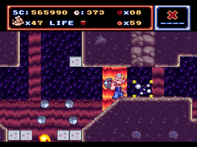 And that’s the problem with Popeye SFC: after the first world, the game keeps repeating the same notes over and over, until the game becomes completely boring. Even the attack patterns of the bosses are variations of the same thing over and over, and the actual levels run out of ideas really quickly. There’s only a handful of tropey themes like forests, plains, houses, castles, etc, that repeat endlessly until the final credits roll. But even the specific levels start to feel repetitive and samey. There were times where I questioned if either they were recycling sections of previous levels or if the game had randomly generated stages. They’re so samey and generic, and I can’t remember a single point during any of them where I thought the layout was clever. MAYBE a section where you step on these gigantic switches that activate trap doors above you that rain enemies and/or items down, but even that gets repeated several times during the course of the game.