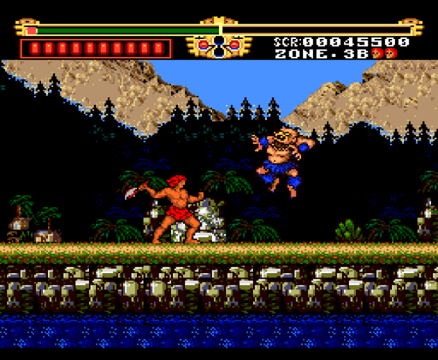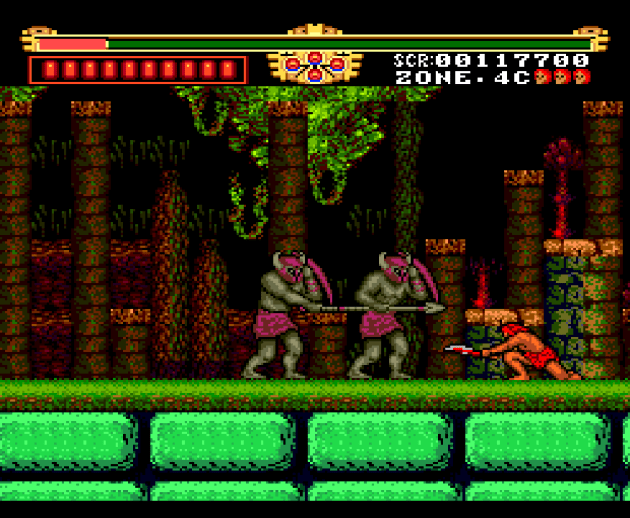 This brief section in the third stage is the game’s platforming at its most complicated. Sometimes you have to jump to a higher series of platforms, but that’s fairly rare. There’s no moving platforms and, at most, you have to time a jump after a fireball or enemies has flown up from the pit you’re crossing. There’s just no imagination at all in Legendary Axe outside the final boss. It’s a remarkably uninspired game. Sadly, some decent jumping physics go to waste.