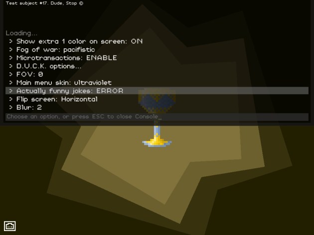 Well here’s Dude, Stop. It can be summed up very simply: WarioWare meets the Stanley Parable. You’re the test subject of a game-solving experiment that involves tiny slivers of mini-games. The hook here is that you’re actually encouraged to fuck up, so as to drive the developer mad. The game is divided into multiple “packs” of mini-games with various themes, all of them having essentially the same amount of play value, with multiple different objectives for each. Beat a pack making all mistakes. Beat a pack making no mistakes. Other times there’s different objectives, like trying to complete a quiz in twenty seconds. Otherwise known as the Derrick Rose method.