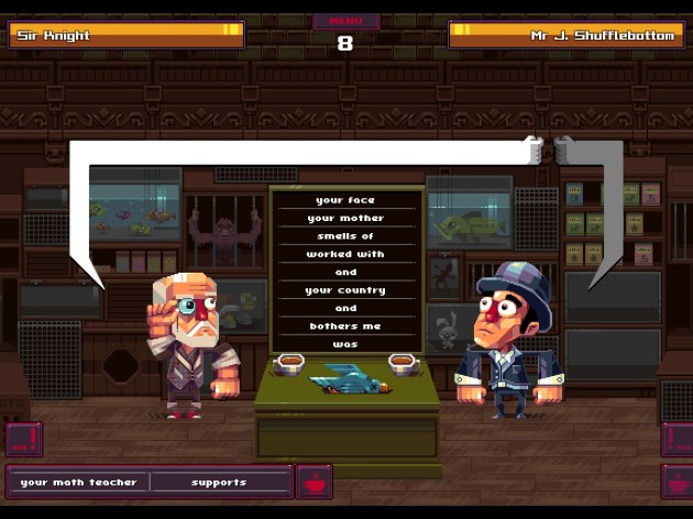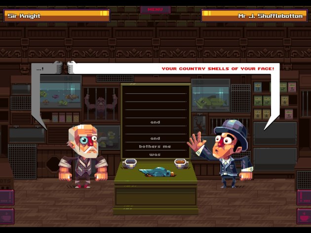 Now I’ll be honest: I had no clue what “ruttish” means. I’m an American, so I don’t speak the Queen’s English. But apparently it means “lustful.” Okay. So this was the best I could do, and it worked to the tune of causing ten points of damage, putting me four points up on the AI opponent. But again, I have to ask, why? Maybe this is a cultural thing and this would kill on the other side of the pond, but I don’t get how this is insulting. I’m didn’t say or even imply that the wife was doing anything inappropriate with the fishmonger. And a fishmonger (which is person who sells raw, typically freshly-caught fish) is a perfectly respectable job. Since the female version of “fishmonger” is “fishwife” which is a common insult, maybe the implication is that by working with the fishmonger, the gentleman’s wife is actually a fishwife? But that can’t be, because it completely ignores the “ruttish” part of the sentence. A few people told me that it’s supposed to be like Monty Python and make no sense and that’s what makes it work. Um, I’ve watched Monty Python. The stuff they say mostly makes sense to me and doesn’t come across like someone trying to assemble a script using what they found while emptying a paper-shredder.