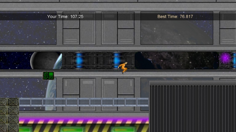 By far the most frustrating thing for me was the pace of the game is crippled by how slow the actual teleporting thing works. When you miss a jump, or you intentionally hit a portal-beam-thingie as part of the level design, your dude doesn’t instantly reappear at the other side. No, instead the game slowly crawls towards the respawn point. This totally kills the pace of the game. To Human Subject’s credit, the timer stops when this happens. Oddly enough, the moving platforms don’t stop moving, which means the teleporting thing is happening in real-time. This suggests that the aliens have perfected interstellar travel, but haven’t figured out how to send information electronically as fast as we’ve been doing since the 1830s. They can fly thousands of light-years, but they can’t communicate faster than the speed of sound. I’m suddenly not worried at all about being invaded by these things. No matter what technology they have, if a two sentence phone call will take them five minutes to complete, I think we have the advantage.