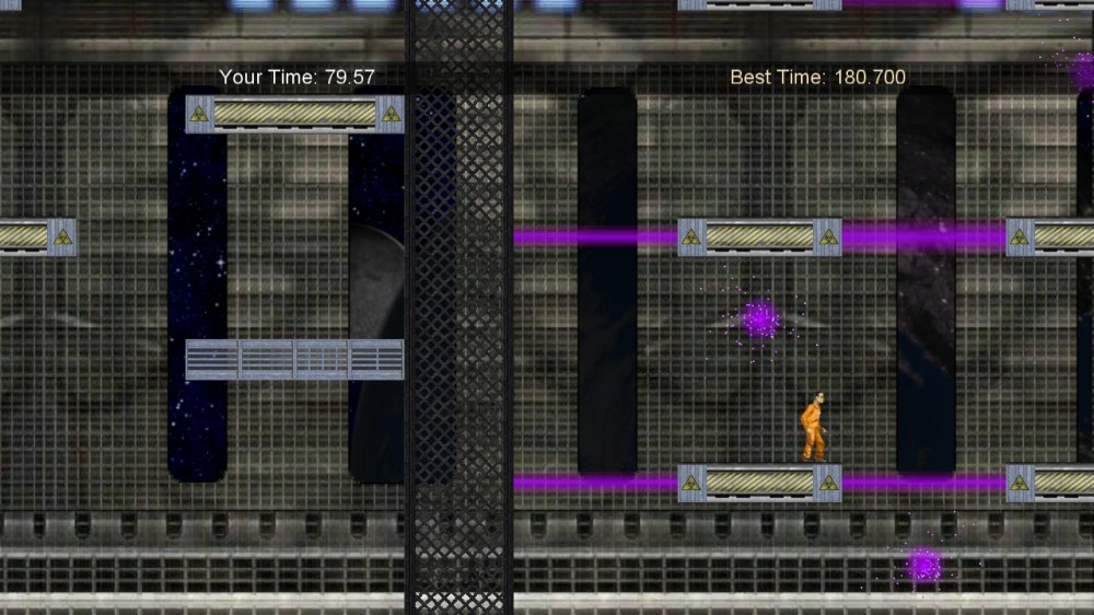 So what is the actual game like? You run, you jump, and you occasionally hit a switch. That’s it. No ducking, no sliding, no wall-jumping, or any acrobatics at all. Levels are mostly of the walk left until you reach the exit variety. Occasionally, something will teleport you somewhere else, but that typically means the exit is somewhere else, restoring the status quo. The hook is you can’t die. Instead, you might hit an energy beam which teleports you backwards to various points in the stage. Otherwise known as dying if this was any other game, but that’s Human Subject’s gimmick so I’ll roll with it.